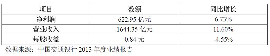 3月30日,中国交通银行发布2013年度业绩报告。根据交行披露的年报报告显示,该行的具体利润及收入数据如下表所示。