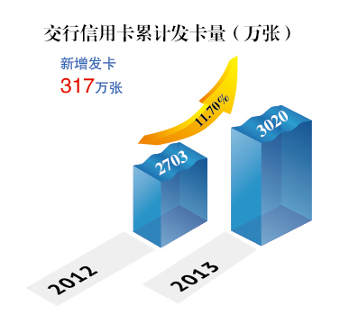 报告显示,交行信用卡业务引入了战略投资者汇丰银行的技术与管理经验,汇集全球与本土双重优势,以“中国人的环球卡”为主旨,致力于为持卡人提供方便的用卡体验和实惠的用卡回馈。报告期内,交行信用卡业务创新实施“Easy for More—方便实惠交给你”的品牌化服务战略,整体业务继续保持快速发展。在发卡环节,优化网络发卡流程,有效缩短客户申请到获卡时长。截止报告期末,信用卡累计发卡量突破三千万张(见图一)所示。2013年,交行全年累计新发卡317万张。
