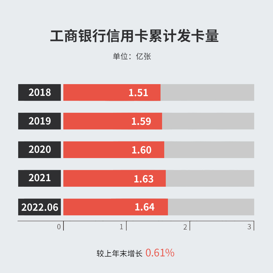 截止2022年6 月末,工商银行信用卡发卡量 1.64 亿张,较上年末增长0.61%;