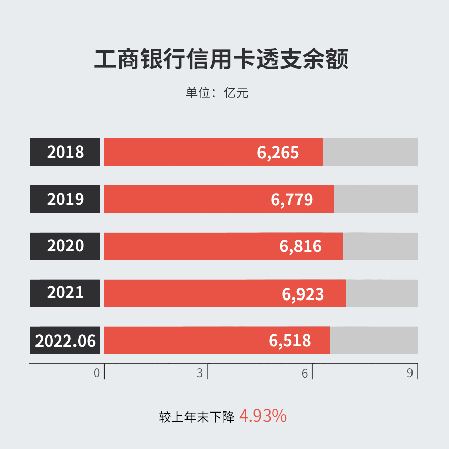 截止2022年6 月末,工商银行信用卡透支余额 6,581.37 亿元,较上年末下降4.93%;