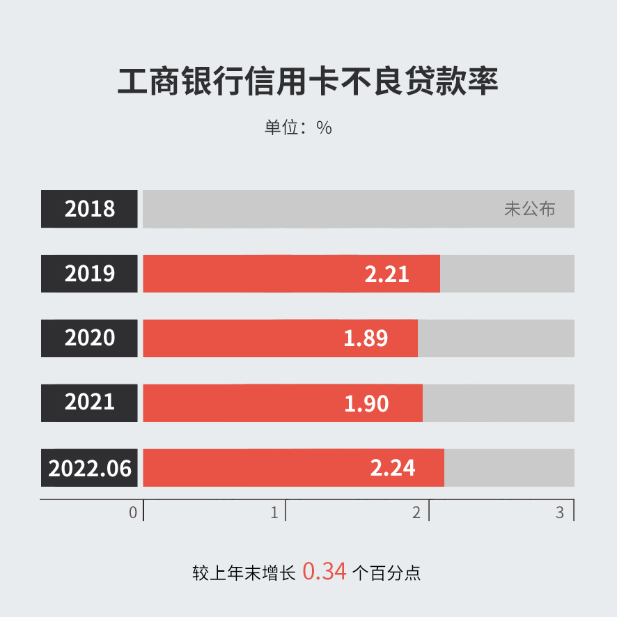 截止2022年6 月末,工商银行信用卡不良率2.24%,较上年末上升0.34个百分点;
