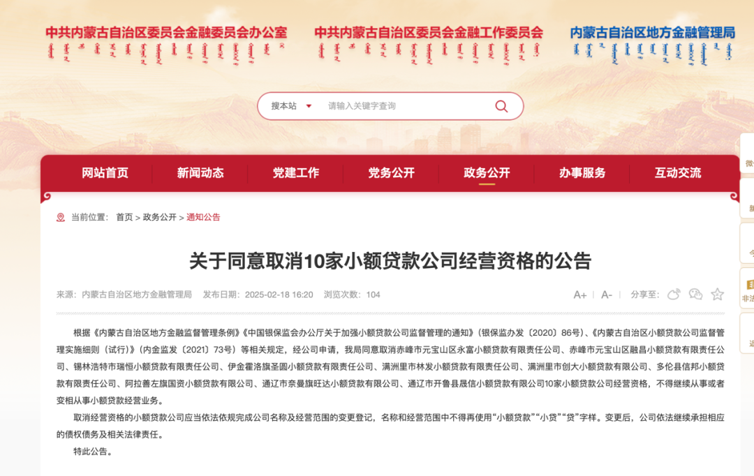 进入2025年,小贷公司退出潮还在持续。作者不完全统计发现,2025年开年至今,江苏、内蒙古、四川、广东、广西等五省金融办已经取消了38家小贷公司的试点经营资格。2月20日,江苏省金融办发布了三家小贷公司终止经营的批复,同意终止南通市海门区苏通科创农村小额贷款有限公司(下称“南通苏通科创小贷”)、南通市通州区恒晟农村小额贷款股份有限公司(下称“南通恒晟小贷”)、仪征市群成农村小额贷款有限公司(下称“仪征群成小贷”)的经营资格。 1月16日,江苏金融办还发布了《关于同意终止南通市海门区大岛农村小额贷款有限公司经营资格的批复》。这意味着,开年来仅江苏一地就有4家小贷公司退出经营。而在2月18日,内蒙古金融办也发布了《关于同意取消10家小额贷款公司经营资格的公告》,取消赤峰市元宝山区永富小额贷款有限责任公司、赤峰市元宝山区融昌小额贷款有限责任公司、锡林浩特市瑞恒小额贷款有限责任公司、伊金霍洛旗圣圆小额贷款有限责任公司、满洲里市林发小额贷款有限责任公司、满洲里市创大小额贷款有限公司、多伦县信邦小额贷款有限责任公司、阿拉善左旗国资小额贷款有限公司、通辽市奈曼旗旺达小额贷款有限公司、通辽市开鲁县晟信小额贷款有限公司10家小额贷款公司经营资格,不得继续从事或者变相从事小额贷款经营业务。 同样,1月10日,内蒙古金融办发布消息,呼和浩特市兴银小额贷款有限责任公司、呼和浩特市兴光小额贷款有限责任公司、呼和浩特市济源小额贷款股份有限公司、呼和浩特市银都小额贷款有限责任公司、呼和浩特市大众小额贷款有限公司、呼和浩特市金蒙小额贷款有限公司、呼和浩特市义特格勒小额贷款有限责任公司、呼和浩特市祥泰小额贷款有限责任公司、呼和浩特市银友小额贷款有限公司、呼和浩特市中网福通小额贷款股份有限公司、呼和浩特市利得小额贷款有限责任公司、呼和浩特市金川开发区金汇小额贷款有限责任公司、呼和浩特市裕景天小额贷款有限责任公司、清水河县金百山小额贷款有限责任公司、包头市利仁小额贷款股份有限公司、包头市汇金小额贷款有限责任公司等16家小额贷款公司符合“失联、空壳”情形,且已由各盟市完成为期30日的名单公示工作,公示期内未收到公示主体陈述、申辩意见。内蒙古金融办同意取消16家小额贷款公司试点资格,要求不得继续从事或者变相从事小额贷款经营业务。取消试点资格的小额贷款公司应当依法依规完成公司名称及经营范围的变更登记,名称和经营范围中不得使用“小额贷款”“小贷”“贷”字样。变更后,公司依法继续承担相应的债权债务及相关法律责任。也就是说,开年来内蒙古金融办已经取消了26家小贷公司的试点资格。无独有偶,2月17日,四川金融办发布公告,同意广元市旺苍县佳铭小额贷款有限公司退出小额贷款行业。 四川金融办表示,小额贷款公司退出小额贷款行业后,公司不得继续经营小额贷款业务,注册名称和经营范围中不得使用“小额贷款”字样,营业场所等不得使用与小额贷款有关的标识。同样,今年1月16日和2月12日,广东金融办发布六则公告,同意潮州市潮安区融信小额贷款股份有限公司、韶关市曲江区宝银小额贷款有限公司等6家小贷公司注销小贷业务试点资格。 而在1月9日,广西金融办也发布了《关于注销北海市威联得小额贷款有限公司小额贷款业务经营许可的批复》,同意终止小额贷款业务经营许可,注销《小额贷款公司经营许可证》。从行业来看,伴随小贷行业监管趋严、竞争加剧等问题,近年来小贷公司持续出清。 监管方面,2025年1月国家金融监督管理总局发布的《小额贷款公司监督管理暂行办法》,进一步细化并规范小额贷款公司经营行为,明确了小额贷款公司业务范围及贷款集中度比例要求,对小贷公司的各类违规行为进行了严格规定。其中,严禁小额贷款公司违规开展“通道”业务,不得出租、出借牌照,为无放贷业务资质的主体提供放贷“通道”等等。 数据上看,截至2024年12月末,全国共有小额贷款公司5257家,贷款余额7533亿元。而在2022年末,全国共有小额贷款公司5958家,小额贷款公司贷款余额9086亿元。也就是说,两年时间里,小贷公司减少701家,贷款余额减少1553亿元。