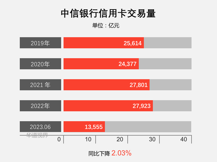 2023年上半年,中信银行信用卡交易量 13,555.33 亿元,同比下降2.03%;