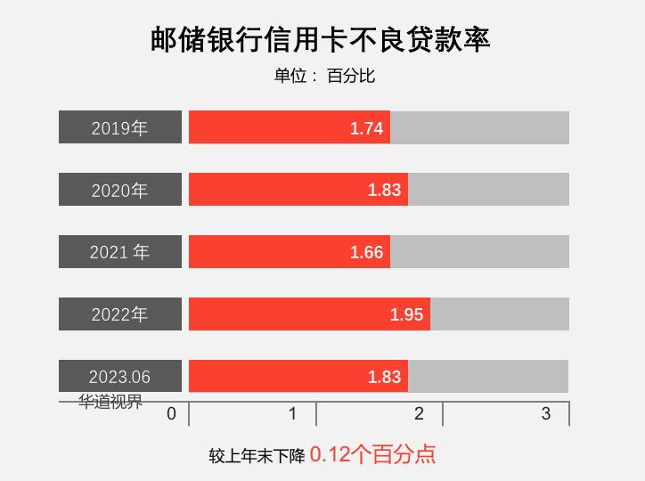 截至2023年6月末,邮储信用卡不良率 1.83%,较上年末下降0.12个百分点。
