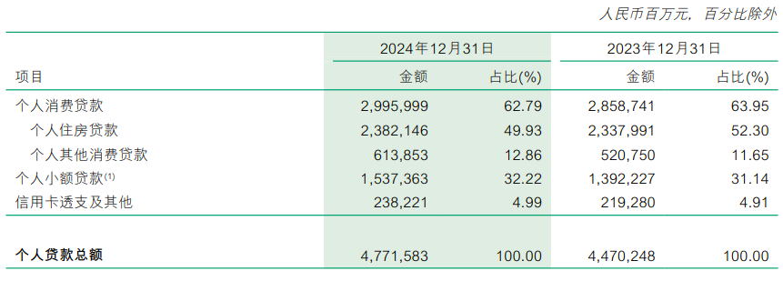 其中,个人其他消费贷款为6,138.53亿元,较上年末增长17.88%,占比12.86%;个人小额贷款(主要为个人经营用途)15,373.63亿元,较上年末增长10.42%,占比32.22%;信用卡透支及其他为2,382.21亿元,较上年末增长8.64%,占比4.99%;其余为个人住房贷款,占比49.93%。