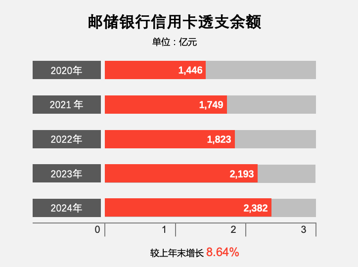 截至2024年末,邮储银行信用卡透支余额2,382.21亿元,较上年末增长8.64%;