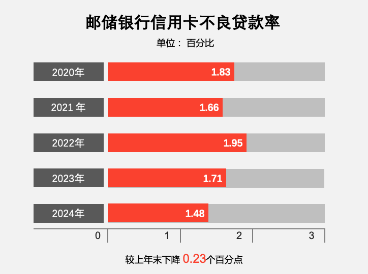 截至2024年末,邮储银行信用卡不良率1.48%,较上年末下降0.23个百分点。