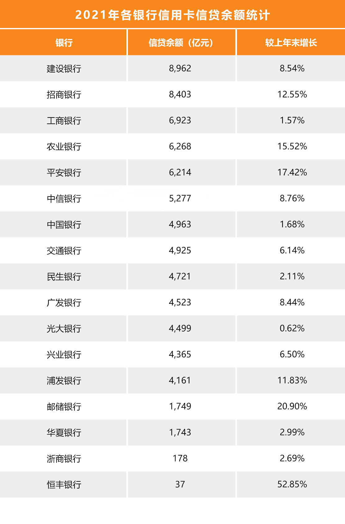 从信贷余额增幅来看,所有银行均实现信用卡信贷余额正向增长,增幅最高的为恒丰银行,较上年末增长52.85%,是唯一一家增幅超过50%的银行。此外,邮储银行、平安银行、农业银行等6家银行实现信贷余额增幅超过两位数。