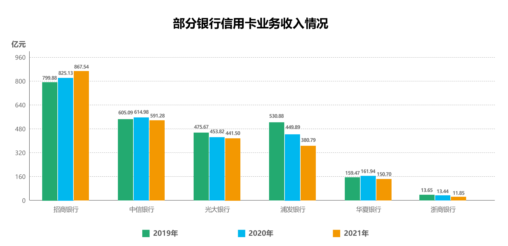 从信用卡业务收入情况来看,在6家公布其信用卡业务收入情况的银行当中,收入最高的为招商银行达867.54亿元,其次为中信银行591.28亿元,而后为光大银行441.50亿元。值得注意的是,招商银行是唯一一家实现信用卡业务收入正向增长的银行,信用卡业务收入同比增长5.14%。