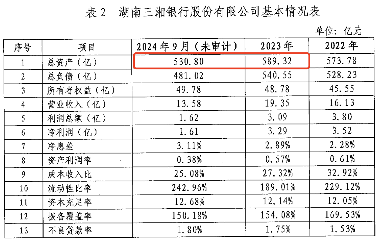 数据显示三湘银行截至2024年9月末总资产规模530.8亿元,相较于2024年初的589.32亿元减少了58.52亿元。
