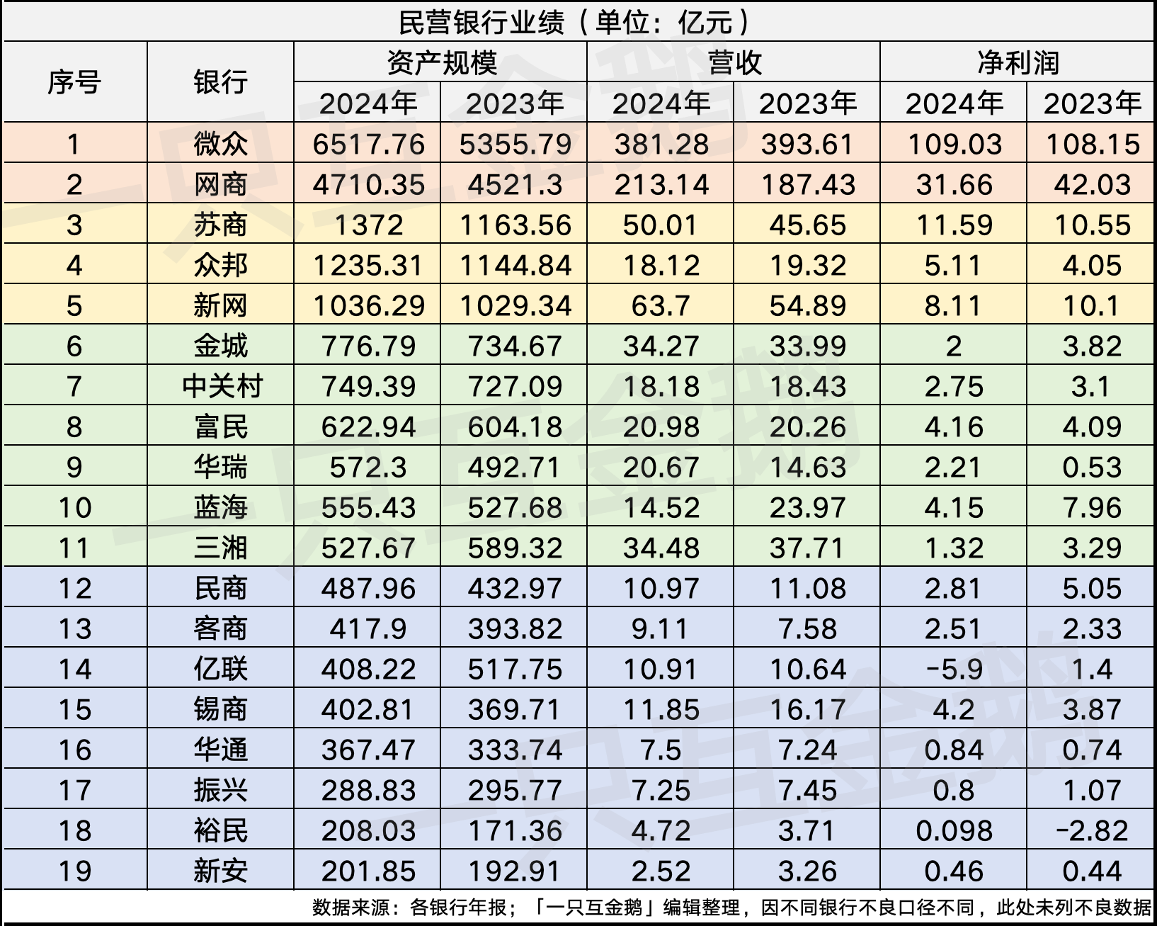 19家民营银行2024业绩出炉!两家巨头资产相加超万亿,均有转型新方向