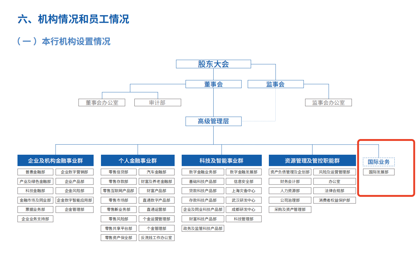 年财报中,该银行组织架构中可清晰看到新增了一个「国际发展部」,这是在去年下半年新设立的部门。