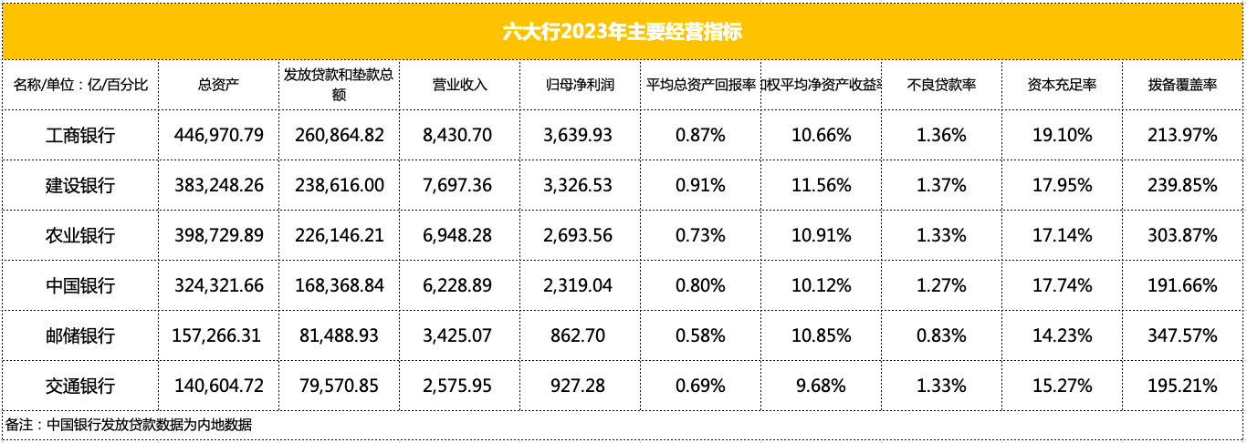 2023年,六大行累计实现营业收入达到3.53万亿元,归母净利润实现1.38万亿元;截至报告期末,总资产超过185万亿,发放贷款和垫款总额超过105万亿元。