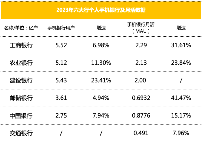 邮储银行发布手机银行9.0,致力于打造“一站式综合服务平台”和“随 身化交互陪伴平台”,基于农村信用信息数据体系,积极探索创新农村金融 服务模式,让农户打开手机银行,即可随贷、随用、随还。截至2023年末个人用户3.61亿用户,月活跃客户规模(MAU) 6,932万户,增速比例最高达到40.82%;交易金额16.01万亿元,同比增长9.28%。