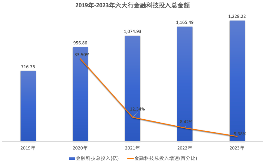 2019年到2023年,六大行金融科技的总投入分别为716.76亿、956.86亿、1,074.93亿、1,165.49亿元和1,228.22亿元,呈逐年上升的趋势,但增速逐年下降,截至2023年,六大行金融科技投入增速已放缓至5.38%。