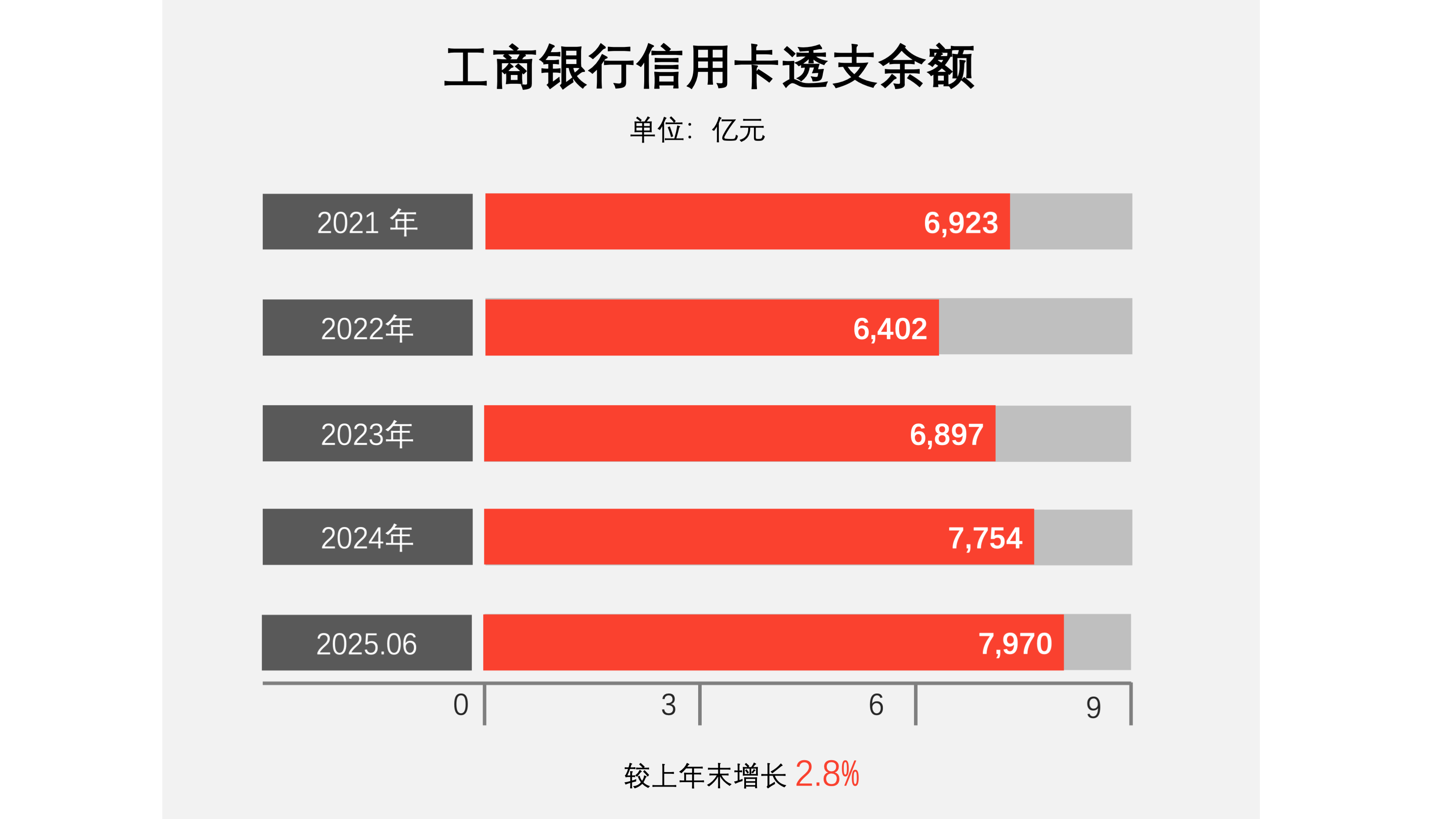 截至报告期末,信用卡透支余额 7,970.16 亿元,较上年末增长2.8%;