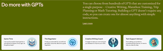 科研人员:从事生物医药、机械制造、金融研究的科学家们,需要一个能够理解和回答高度专业领域问题的助手,可以通过自己积累的数据开发一个自定义GPT,用于查阅、回答专业文献、实验数据和研究笔记,甚至辅助撰写学术论文。同时可以借助GPT商店分享给全球其他同类型的科研人员使用。教师:老师希望可以提供给学生一个可以练习对话、纠正发音、批改作业的产品。可以利用自己积累的学生作业、录音资料以及教学资源构建一个自定义的GPT助手,来满足上述功能,同样可以在GPT商店分享。