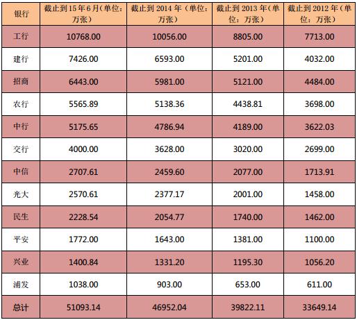 表1:各大银行2015年新增发卡量汇总(降序排列)