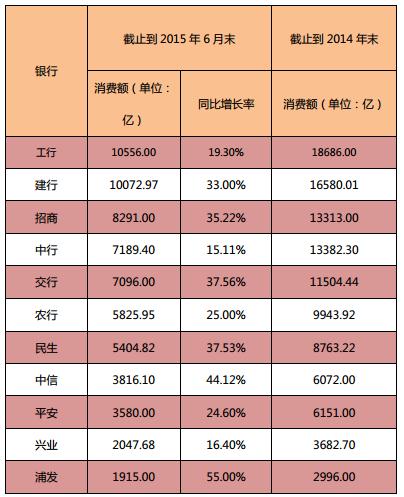 表4:各大银行信用卡消费额详情(2015年消费额降序排列)