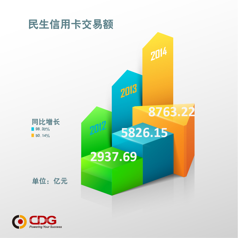 在用卡推广方面,不断扩大特惠商户规模、提高商户质量,转变商户结构,全国特约商户5.2万户,为客户提供了涵盖衣、食、住、行的全方位增值服务。此外,还成功建设了外交部12308全球领事保护与服务应急呼叫中心利民惠民公益工程。报告期内,民生信用卡交易额有较大幅度的增长,同样,增速较上年也有大幅下滑(见图三)。