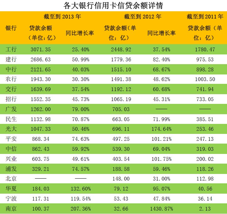 表4:各大银行信用卡信贷余额详情(2013年信贷余额降序排列)